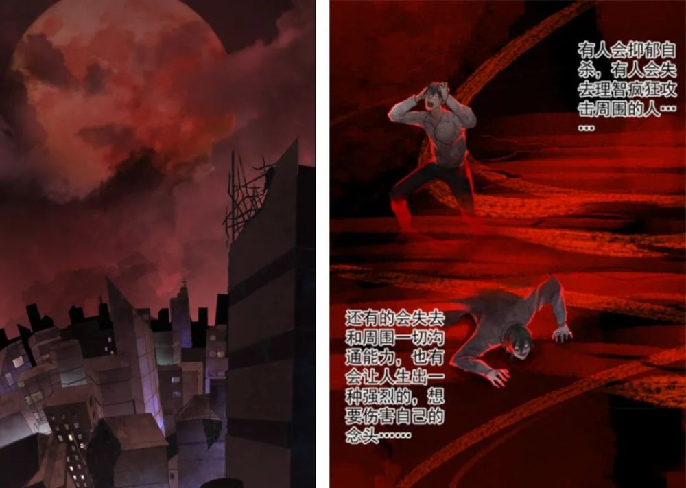 故事发生在公元2030年的未来,天空出现了一轮神秘的红色月亮,超过七成人类受其影响被精神污染,变成了吃人的疯子,只有少部分人类存活了下来。
