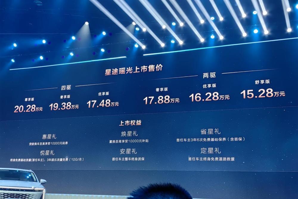 2023年2月21日,星途瑶光正式上市,售价为15.28-20.28万元。作为星途品牌2.0时代第一款战略车型,星途瑶光此次推出了两驱和四驱车型,满足了不同消费者的用车需求。另外,新车还搭载了丰富的配置,打造出了能让人眼前一亮的奢华感。