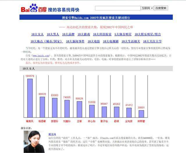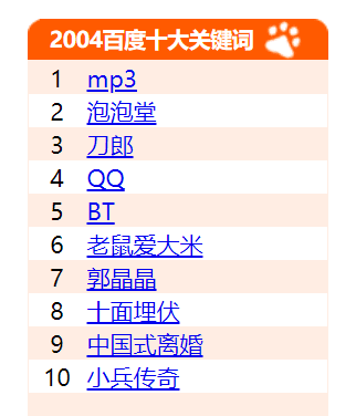 这个榜单最早可以追溯到2002年,当时的名称叫做“疯狂搜索关键词排行”,也就是下图这个,排出了13个子榜,不过当时的网络文学还处在萌芽阶段,02年起点才刚刚成立,所以排的时候就没有搞网文排行榜。