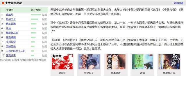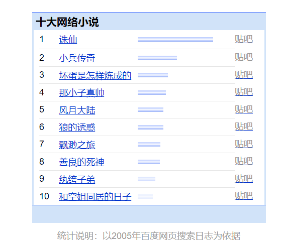 到了2005年,百度正式确定了这个榜叫“年度搜索风云榜”,也就是在这年有了第一次的“年度十大网络小说榜”。