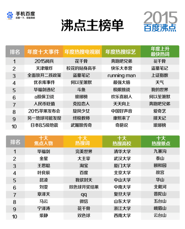 没有网文排行榜,但是在年度十大热搜词里面出现了四本网文,分别是辰东的《完美世界》,天蚕土豆的《大主宰》,耳根的《我欲封天》还有fresh果果的《花千骨》,花千骨纯粹是那年电视剧爆火才带起来的,原著是08年发表在晋江的同名小说。