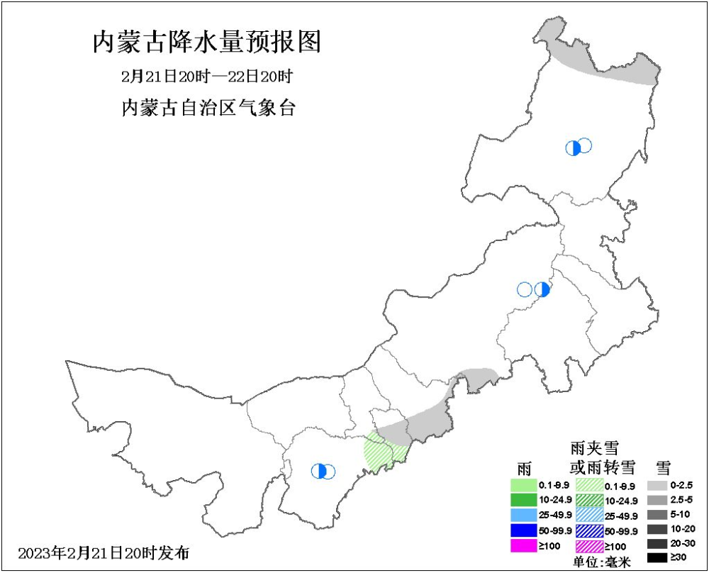 阿拉善盟东北部、巴彦淖尔市东南部、鄂尔多斯市大部、包头市中部和南部、呼和浩特市、乌兰察布市南部有小雪或雨夹雪,对交通出行有一定影响,提醒司机朋友控制车速,保持车距;并注意防寒保暖。