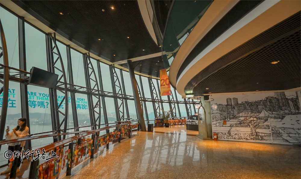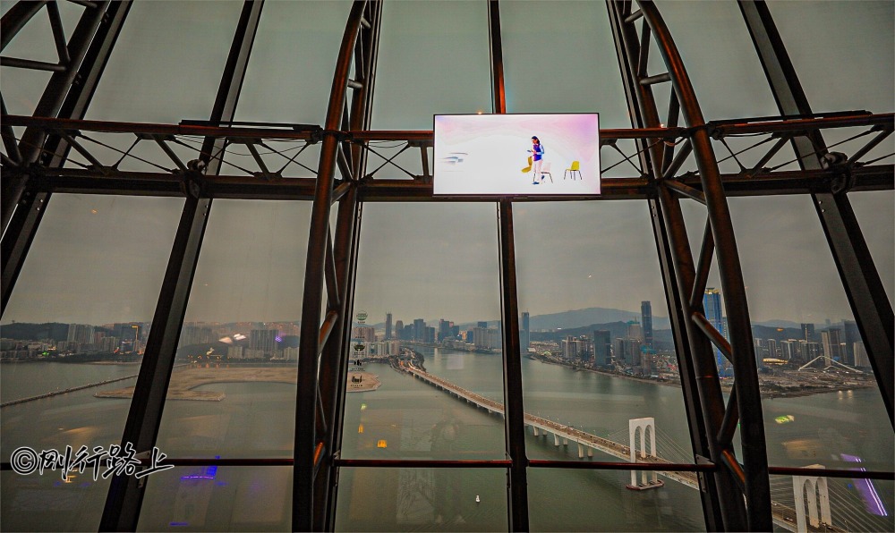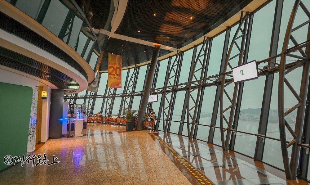 登上高速电梯,几分钟就能到达观光层。站在塔的观光廊,透过明亮的玻璃窗,澳门、珠海尽收眼底,如果是晴天还可以看到香港的大屿山岛。有恐高症的朋友要做好心理准备再上去哦~