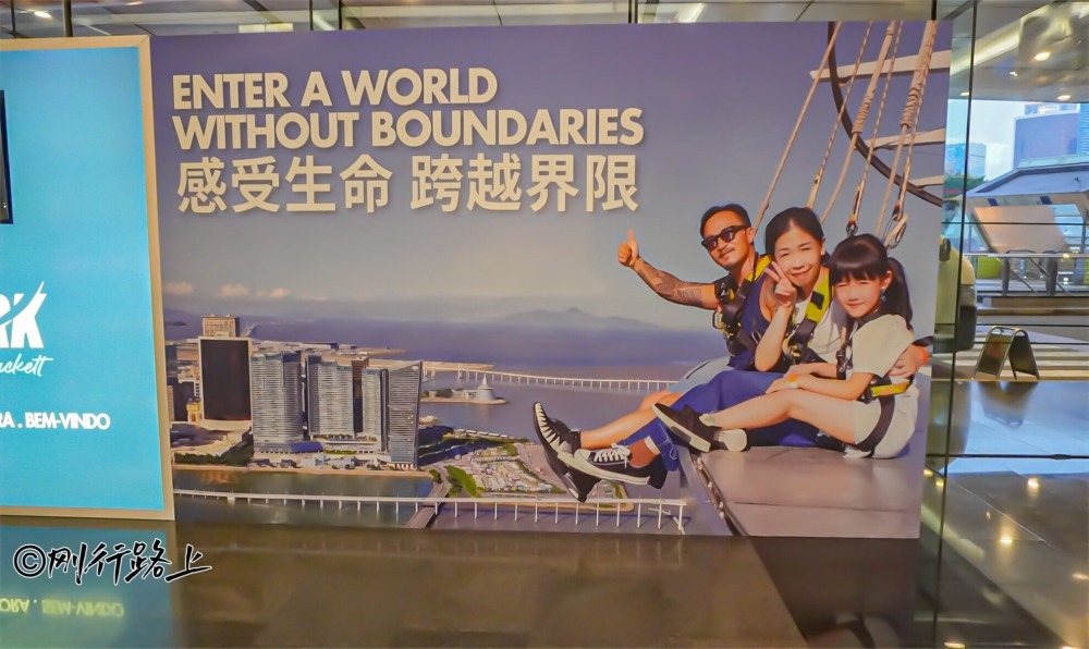 就不得不提57层的天空漫步和蹦极项目,拿着项目的纸质票去兑换门票,签下生死状的同时会送一件纪念T恤,然后就可以在223米的高空一跃而下了;在338米的顶峰漫步,全程不设扶手的露天钢架上绕圈步行,俯瞰澳门美景的感觉,只有尝试的人才知道。我并没有参加,太需要勇气了。