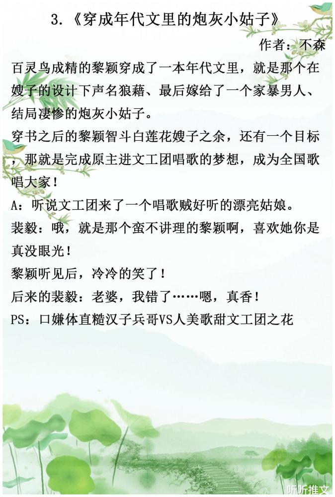 百灵鸟成精的黎颖穿成了年代文中的炮灰小姑子,穿书之后黎颖智斗白莲花嫂子,完成原身进入文工团唱歌的梦想,并与兵哥哥裴毅不打不相识,最后,爱情事业双丰收。故事文笔细腻,背景设定别出心裁,人物刻画生动,感情丰沛,女主面对困境勇往直前,活出自我,正能量满满。