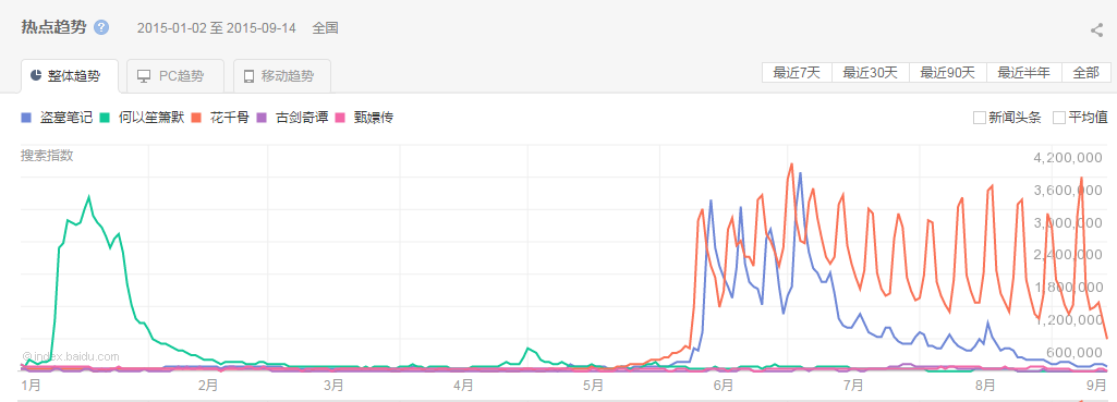首先,在搜索指数上,不要说网络剧了,它比以往所有热门电视剧都高,唯一能与其匹敌的,也就是上面提到的目前在播的《花千骨》。