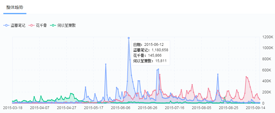 如图,《盗墓笔记》最高峰118万,秒杀所有热门电视剧,几次热议高峰都超过了《花千骨》的最高峰值。
