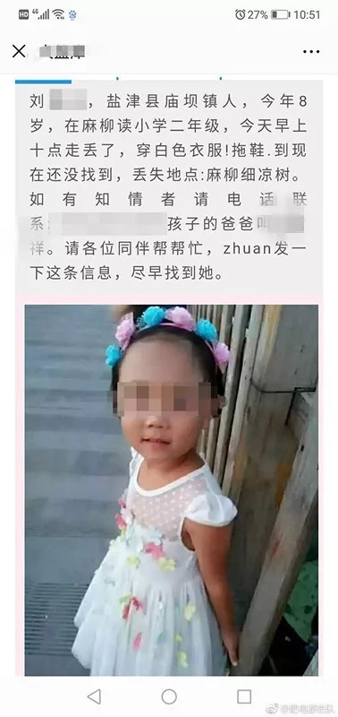 8月24日,云南昭通盐津县庙坝镇8岁的小女孩刘小雨(化名)突然失踪了,心急如焚的家人和派出所组织动员了100余人参与寻找。