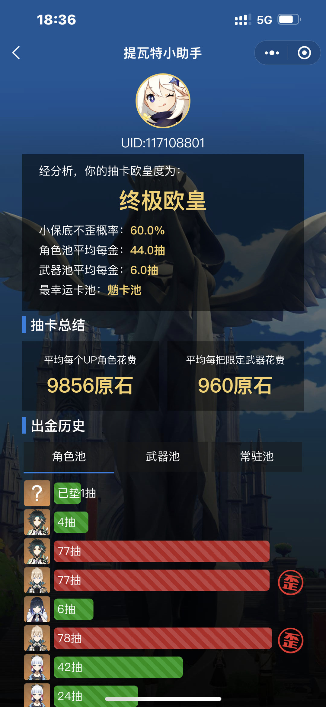龙百万解答:这位玩家的抽卡概率是正常概率,但是不歪就是欧,所以评个小欧皇还是可以的。
