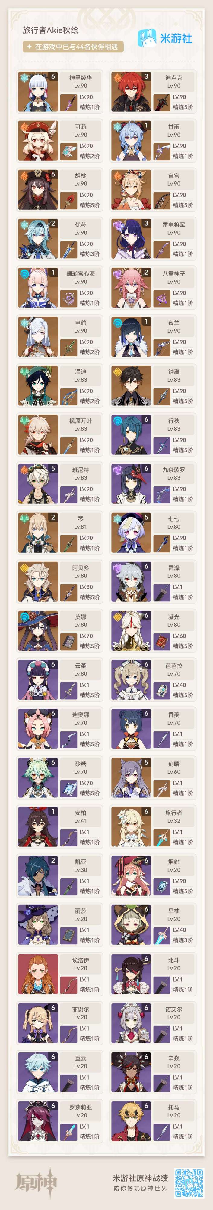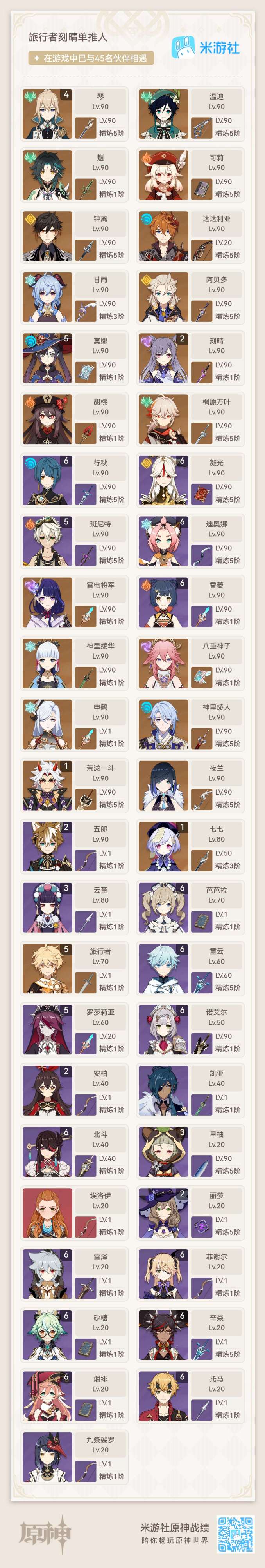 上图所示,这位玩家把神里绫华,神里绫人,八重神子和雷电将军都升到了90级,算是成功走过了地狱路,现在开始享受天堂的美好了。