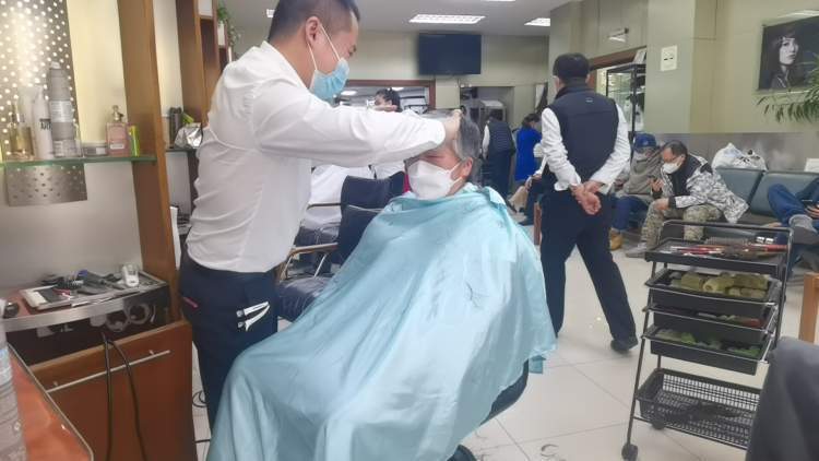 小刘跟着张阿姨到角落的水斗里洗完头,又回到座位上吹干,张阿姨拿着梳子和剪子帮他做最后的调整。小刘连连夸赞张阿姨手艺好,张阿姨谦虚道:“毕竟剪了这么多年呢。”