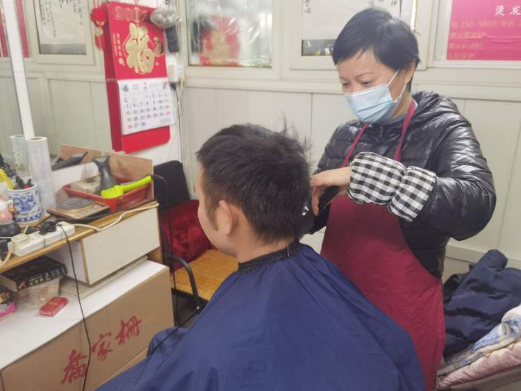 在对面做保安的小刘今天来找张阿姨剪头发,这是他第一次来这里。“我老家河南的,二月二有剪发的习俗,以前我都在大店里面剪,这里是我同事推荐的。”