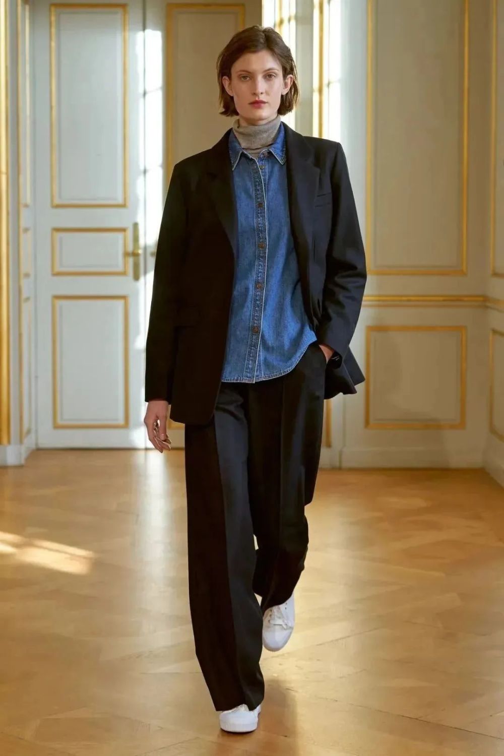 牛仔衬衫还特别适合做内搭,放在一些容易显严肃的单品里,可以让它们一秒变轻松变时髦。北方的朋友,现在这招很好用。比如搭配深色西装▼