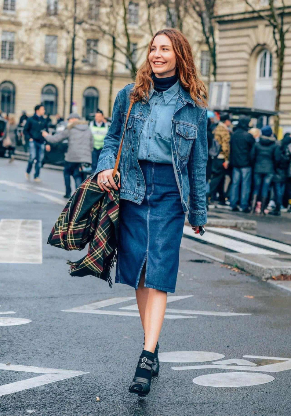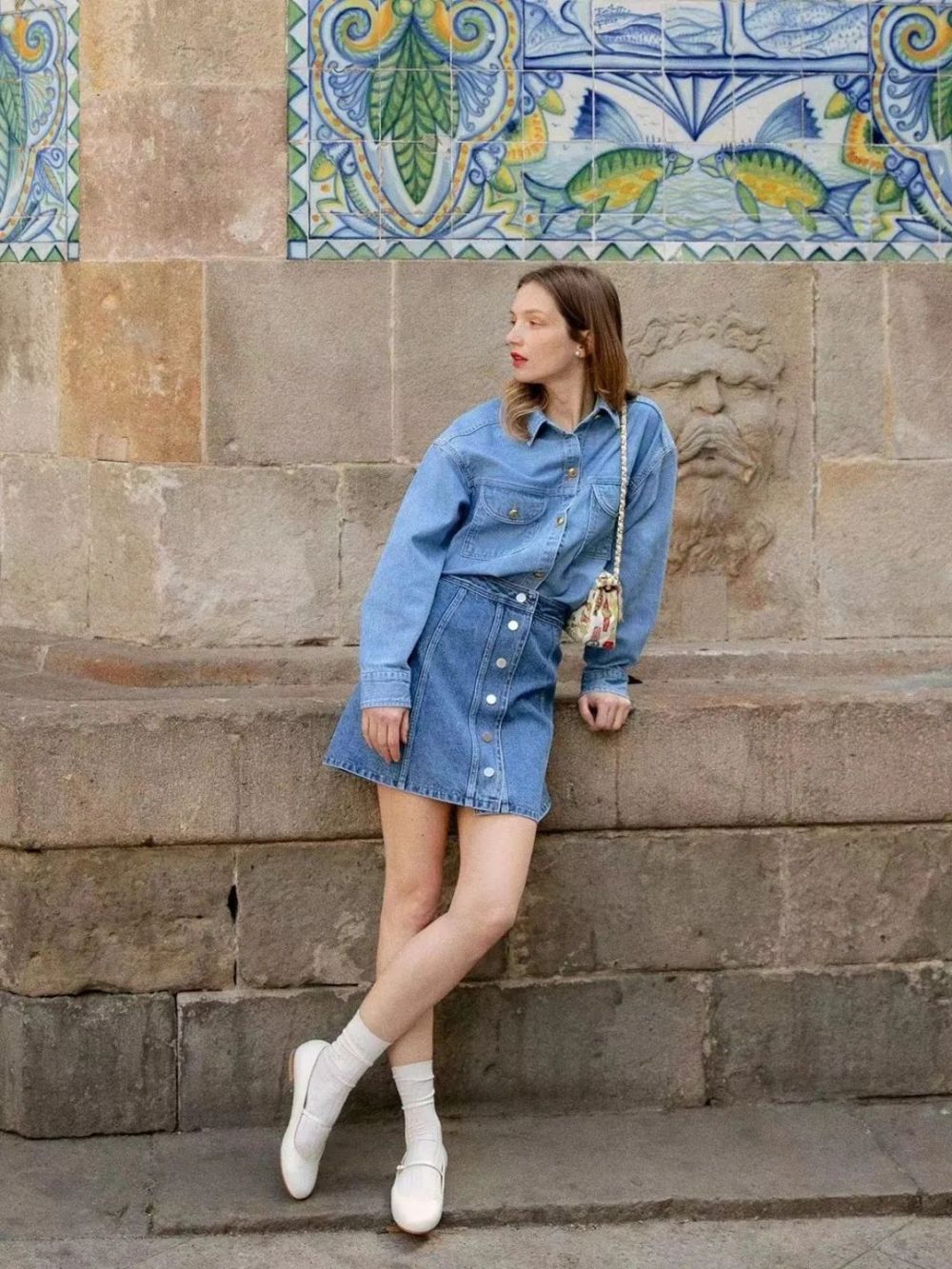 牛仔搭牛仔,其实不一定要选裤装,牛仔半裙也一样成立。