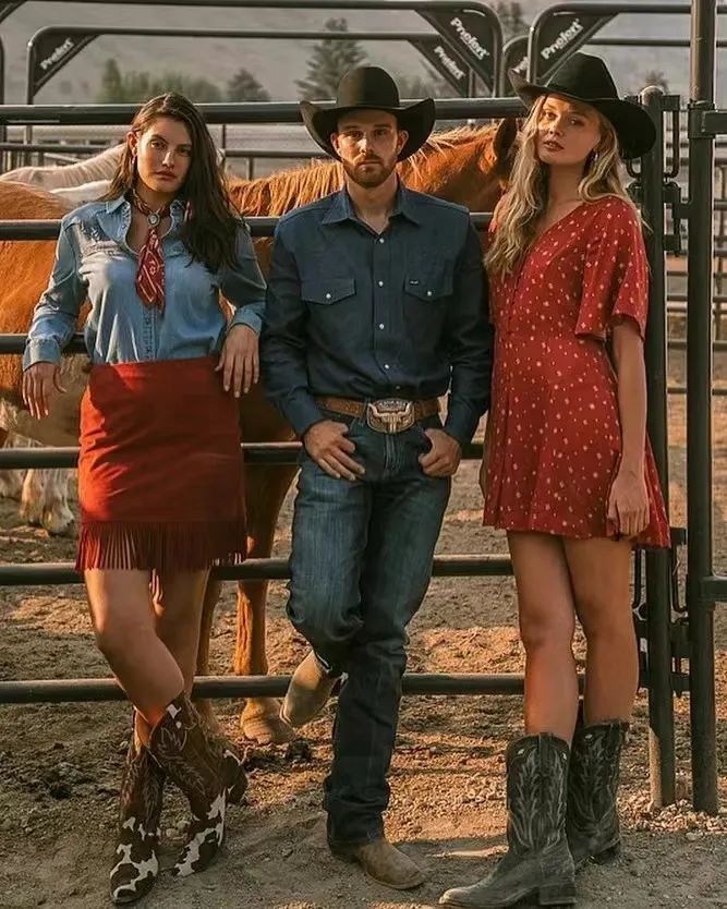 不仅用于装饰,日常还能充当毛巾和抹布,骑马时掩面防风沙,受伤时止血,甚至划分队伍时可以作为信号旗。相当实用,哈哈。因此,鲜艳色方巾(特别是红色)是西部牛仔们的穿搭标配。▼