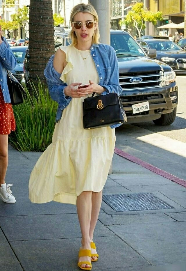连衣裙也是建议从配色入手,清爽又明媚的黄色、绿色、白色都可以试试。Emma Roberts▼