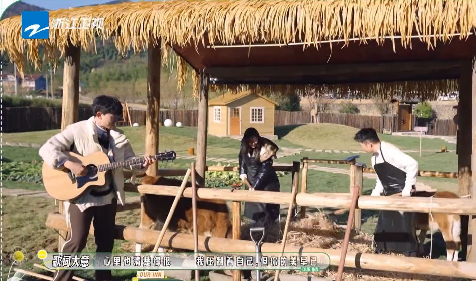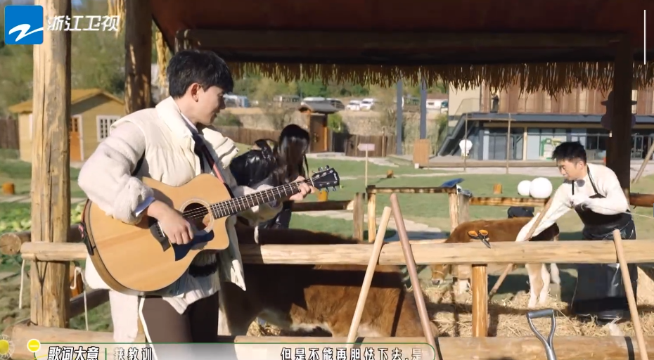 当牛到达牛圈之后,唐嫣、杨迪等人给牛整理着草料,而张杰则拿了一把吉他在牛圈外边弹边唱,这似乎有点“对牛弹琴”的经典场面。
