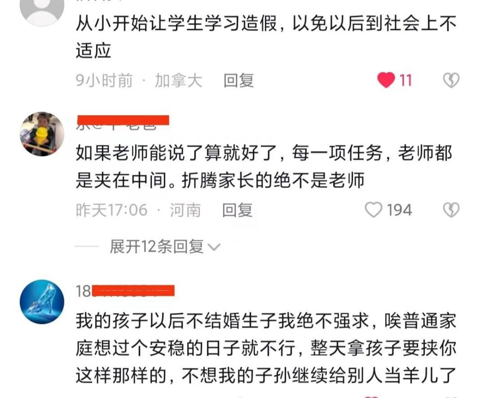 而家长上班时间,多无闲暇来完任务,下班回家之后,孩子催,老师也催。若是不会操作答题,还要各种网上搜索,找人询问。自已上班忙了一天,还没做饭,就要先整这些弄虚作假之事,心中自是气愤难平。