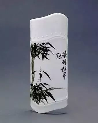 筒外壁以黑彩为主,画墨竹两枝,透过茂盛的竹叶隐约可见嫩枝新发,生机勃勃。竹枝于黑彩外又润以绿彩和赭石色少许,风格苍劲潇洒。另一面空白处题行书诗句:“终获万龙化,曾留彩凤吟。”下有“西”“园”阳文联珠方印。此墨彩笔筒将诗、书、画、印结合于一体,极富文人情趣。