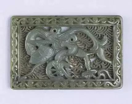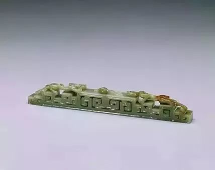 屏青玉质。正面凸雕“渔樵耕读”的故事题材。背面屏心光素,饰回纹花边。碧玉仿木形式屏座。古人以玉象征君子之德,故此屏采用青玉之质正与所琢故事之旨相映合。