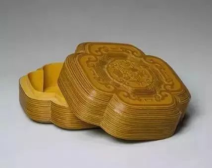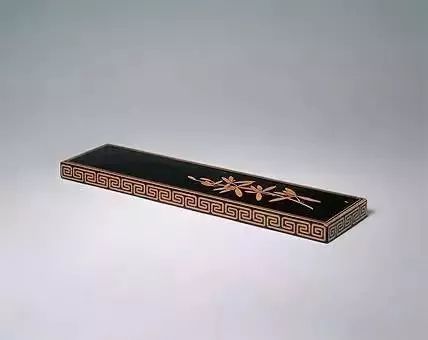 笔匣长方形,匣内巧做活动的上下五层拉屉。屉上分别卧有笔槽,每层可容纳10支毛笔,共50支成套。笔匣以红漆为主,黄、绿两色漆作锦地,通体雕饰江南山水图景,匣内屉座及匣底连体阔座均雕缠枝莲纹,匣顶中央回纹长方界栏内原嵌“天葩垂露”四字。雕饰层次清晰有致,远山近水,林木掩映,颇富诗情画意。整个漆匣色彩艳丽,雕工精细,为乾隆朝宫廷造办处剔红器之佳品。