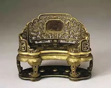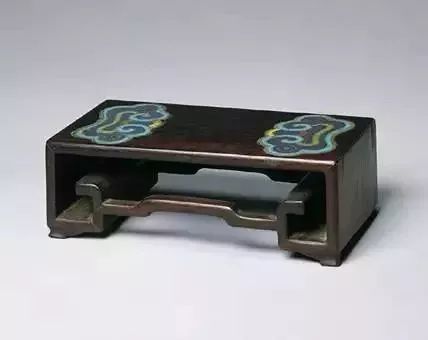 小几为置于书案上的小型陈设,增添了案上的空间层次。此几小巧玲珑,虽为铜胎但造型却显轻盈,修饰地色沉着,花纹规整,不求纹彩耀目抢眼,但富贵雅丽之气自足。