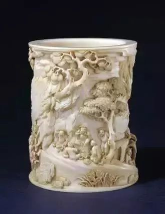 笔筒以水晶琢成,于晶莹剔透的质地上雕饰松猿图,极富自然情趣。