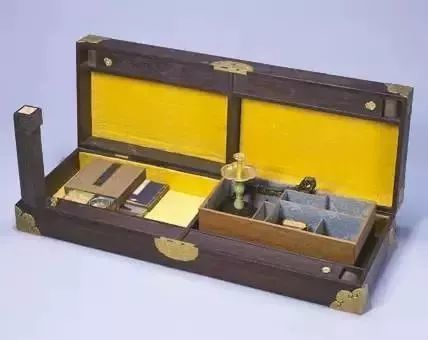 文具箱紫檀木制,折合为箱,箱盖、箱底展开为长方形书桌,桌腿设计在箱槽内,可活动支撑,用铜鎏金暗扣固定,设计巧妙。箱内放置两个同样大小的屉盒,屉盒双层,形成大小不同的多宝格,可容纳60多件质地、造型各异的玩,如白玉洗、松花江石砚、青玉臂格、笔筒、兽镇、石章、描金云龙纹笔、朱墨、画卷、书册等等,每一件文具都有固定的位置,每一位置均按器具大小而设计,严丝合缝。此旅行文具箱为皇帝外出巡游时携带使用,设计精巧,堪称清宫文房用具中的杰作。
