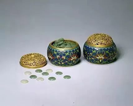 盒作鼓形,上附铜镀金镂空花纹盖。腹部在宝蓝色地上饰对称的勾莲纹4组,其上下边沿各饰天蓝色云头纹一周。花纹虽无特别之处,但做工精致,仍能反映出乾隆时期掐丝珐琅的工艺水平。二盒内分别盛装白玉、碧玉围棋子。