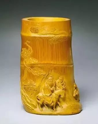 笔筒弯曲竹竿式,三节痕宛然可辨。器表浮雕山水、树木及人物为饰。下部高浮雕一老者骑驴缓行,身旁一小童相随。驴腿脚处还应用了镂雕技法。整体而言,浮雕愈向上愈浅,局部树纹以留青法表现,口沿下云气则为阴刻而成。