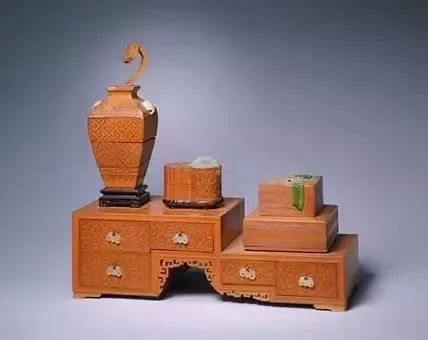 此组文具盒炕几式,高低二级错落有致。通体包镶文竹,又嵌玉书签、青玉蟠螭等饰件。工艺精益求精,造型多变而具装饰意味,极好地展现了文竹工艺独到的美感。