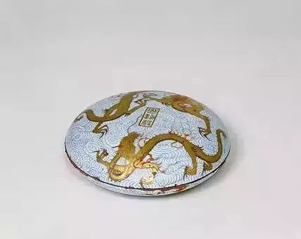印盒扁圆形,盖面及器壁淡描青花祥云纹为地,上绘两条金彩五爪行龙飞腾于云海之间。盒盖面正中金彩方框内书“懋勤殿”金彩三字。底足内施白釉,署青花篆书“大清嘉庆年制”六字三行款。此印盒为当时懋勤殿内所陈设的御用文具,至今盒内还残存有当时用过的朱砂印泥。