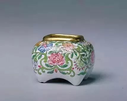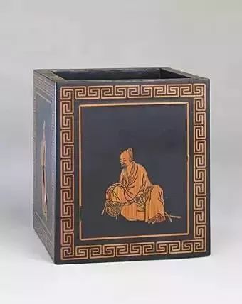 笔筒方体委角,四面在黄色珐琅釉地上饰红蝙蝠及蓝色蟠螭纹,中央长方形委角开光内绘凭窗母婴图,人物神态刻画得细腻生动,用笔工致,体现出乾隆朝人物题材画珐琅器的制作水平。