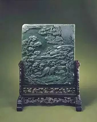 屏长方形,碧玉质,玉有浅绿及深色斑纹。屏面凸雕水畔石崖,崖下松树5株,鹤2只,又雕嫩竹、水草、万寿菊及灵芝等,上浮游云,下漫溪水。砚屏以“松鹤延年”为题,寓万寿长青之意。此屏碧玉色泽葱郁莹润,与画面意境相得益彰。