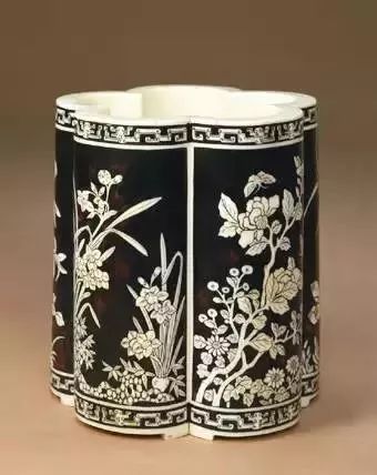 笔筒呈五瓣梅花式,外壁雕水仙、山茶、荷花、月季等四季花卉,寓“四季荣华”之意。花卉等纹饰外减地填黑漆,画面黑白相间,对比鲜明,如同工笔画,韵味别具,是一件以刀代笔的牙雕精品。
