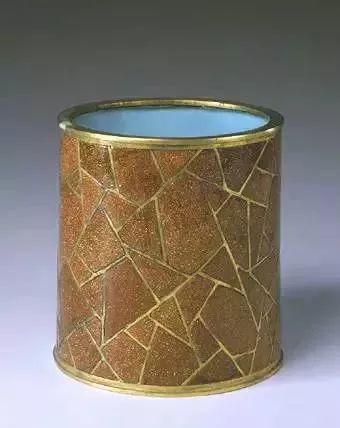 笔筒铜胎,外壁通体錾刻冰裂状几何纹,然后嵌入金星玻璃薄片,筒内壁满涂浅蓝色珐琅釉。此器须铜作、珐琅作、玻璃作共同合作下完成。冰梅纹为明清人喜爱的装饰题材,简洁雅致。此笔筒用金星料又平添了几分富贵气象。