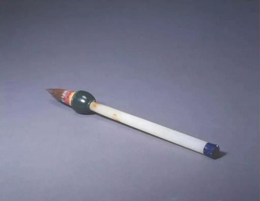 笔管青玉质,笔顶端镶青金石,下端镶碧玉笔斗。笔斗纳束紫毫,笔头的根部装饰红、蓝、黄多种染色毫毛。