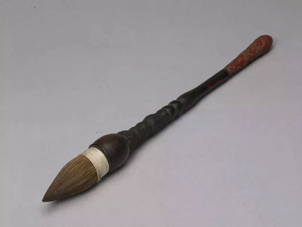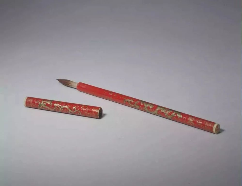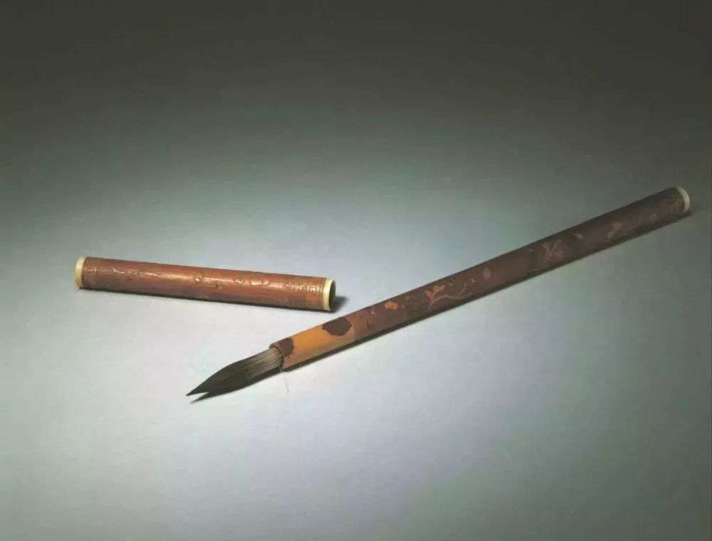 提笔直管无帽,笔管饰红、酱色雕漆并拼以紫檀木,紫檀斗,笔锋为貂毫竹笋式。此笔反映了明嘉靖年间雕漆的风格。