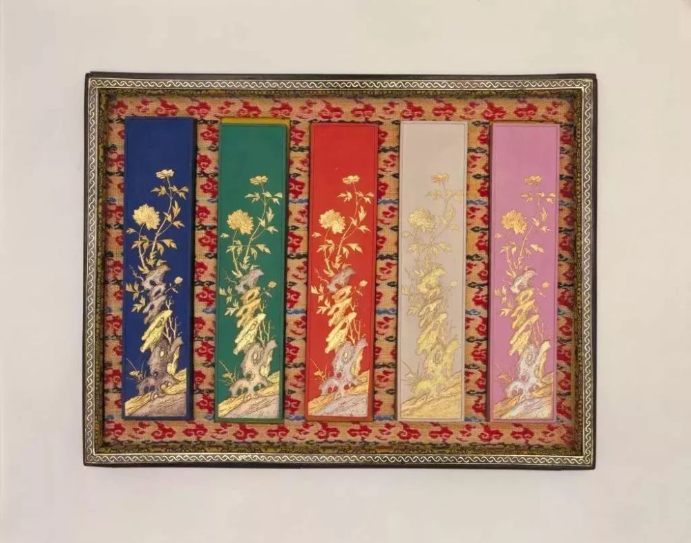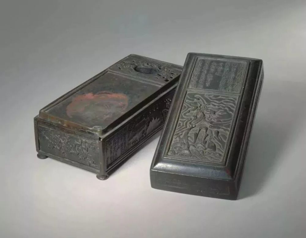 5锭彩色墨,分红、青、绿、白、藕荷五色,其形状、规格、图案完全相同。墨均长方形。套墨5锭皆装于黑漆描金彩色双龙戏珠纹漆盒内,盒盖面中央有描金隶书“大富贵亦寿考”字样。