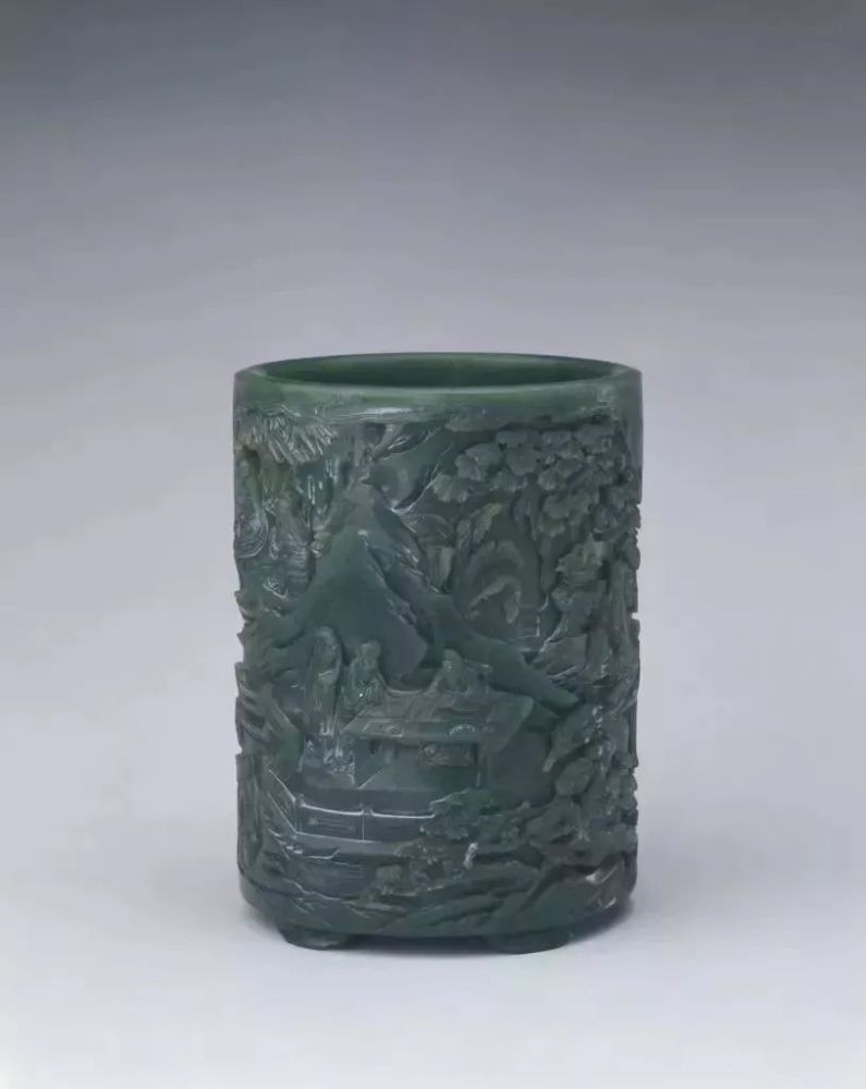笔筒为碧玉质。圆筒形,外壁通景雕刻西园雅集图案。上部雕大块的山石、竹林、花草、人物;下部雕小桥、流水、松树、栏杆、桌椅、人物等。图中共有10余老者或写字、作画,或交谈、观景,或在摩崖刻字等等。器底部出五矮足,等距,底部中心琢阴文隶书“乾隆年制”四字款。
