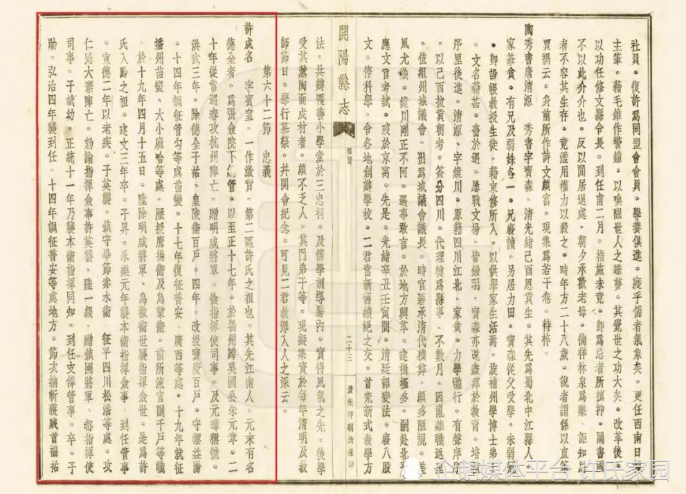 民国《贵州通志》载:“许成名,字宾实,以弟子员袭指挥使。剿毛口六坠贼,平之,擢安南游击。疏通滇黔大道,升赤毕总兵官。平桃红坝,大捷,斩安邦彦、莫德,献俘京师,寻改镇黔楚,剿寇有功。予告归,年七十三卒。(《康熙通志》)”[1]乾隆《毕节县志》载:“许成名,以书生投笔,官总兵,崇祯间督兵斩安邦彦等,时称名将。”[2]清李珍《明季水西记略》曰:“许成名,字宾实,贵州赤水卫举人。以弟子员袭指挥使。平毛六壁贼,擢安南卫游击。疏通滇黔大道,升赤毕卫总兵官。崇祯二年(1629),奉朱燮元命率兵佐剿永宁,奏捷于桃红坝,献俘京师。水西平,成名与侯良柱争功,改镇全楚。年老,予告归。”[3]这些记载仅传述许成名本人,而未涉及许氏家世及后嗣情况。