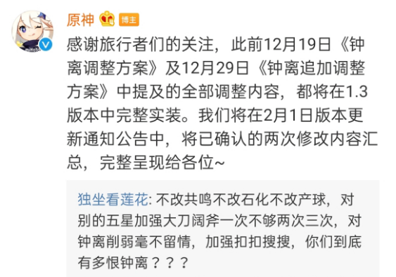 1月22号,米哈游给钟离玩家吃了一颗定心丸。上图所示,米哈游官宣钟离调整结束,将在1.3版本中闪亮登场。这说明:之前钟离护盾减抗的机制没有被削弱,钟离再次出山肯定会一鸣惊人。但是看评论区貌似有些玩家不买账,仍然发表了一些抨击策划的评论。