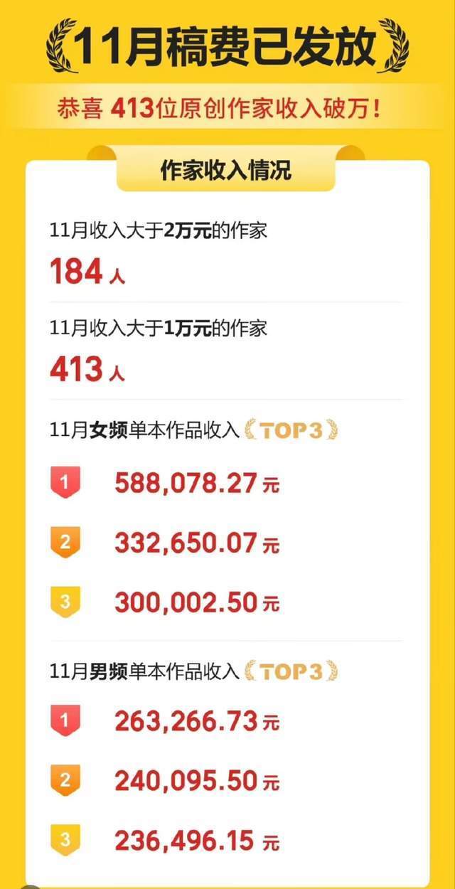 3、七猫公布11月作者稿费,最高单本作品月入58万