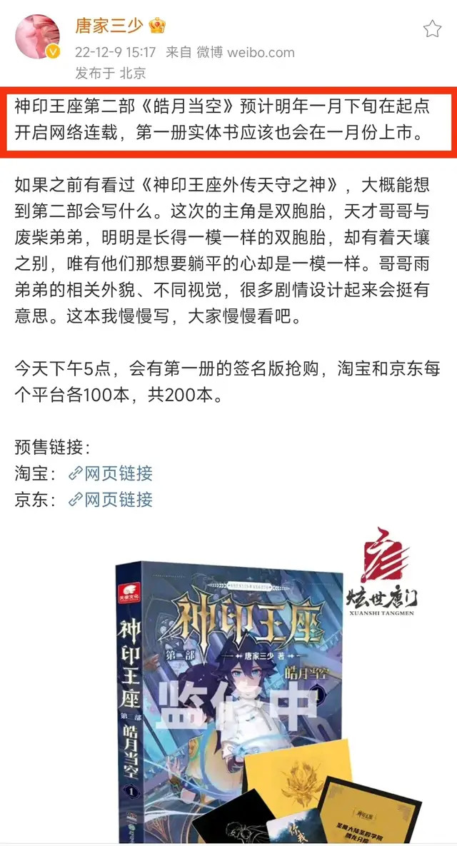 唐家三少在今年5月初就说了斗罗系列完结后下一本会写神印王座的第二部,在我看来就是想蹭动漫的热度,狠狠恰一波动漫粉和怀旧粉的钱。毕竟现在神印王座的动漫热度正高。一部斗罗大陆动漫的爆火让唐家三少靠买实体书和周边赚的盆满钵满,可想而知,神印第二部借着动漫爆火的东风估计又能大赚一笔。