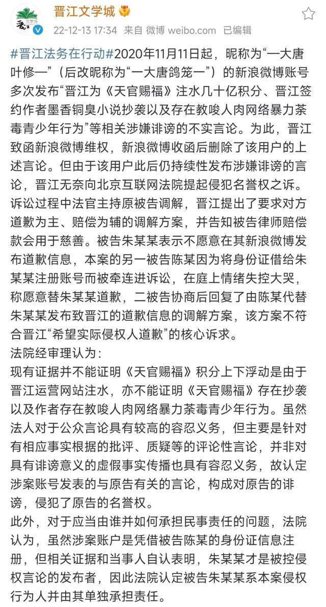 16、晋江将说《天官赐福》积分注水的用户告上法庭,该用户被罚道歉