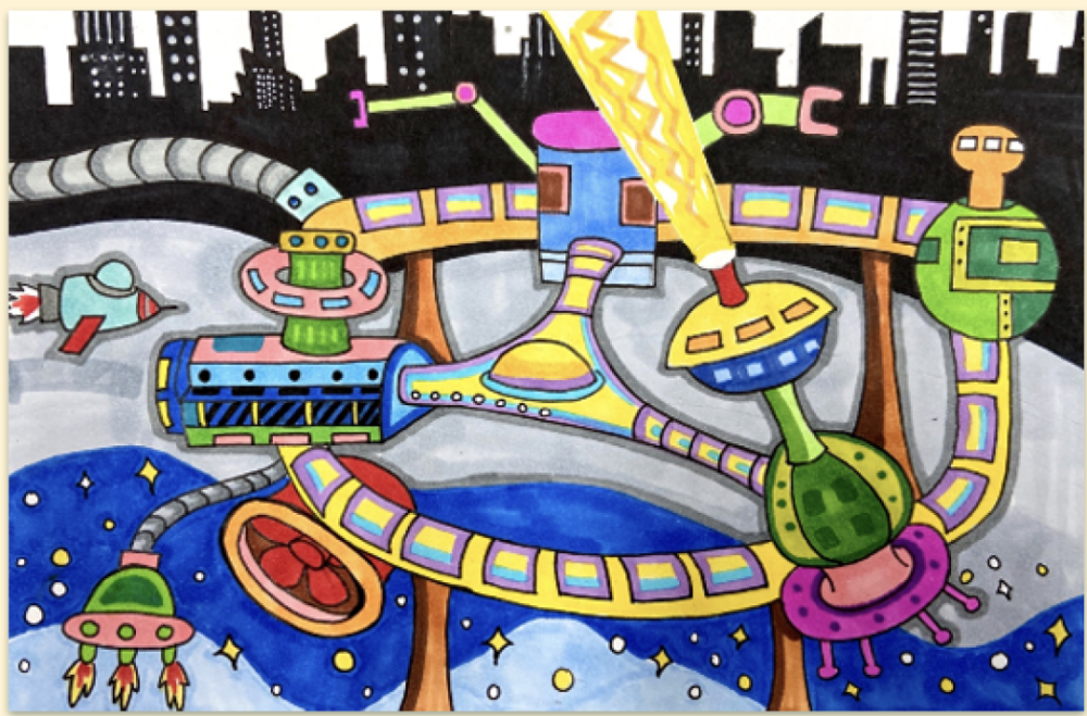 例如这个科幻主题的作品,小画家充分发挥自己的想象力,复杂的轨道,造型奇特的飞船飘荡在城市的上空,其中一座飞船准备发出黄色冲天的光芒似乎马上就起飞,也似乎是在和外星人交流。