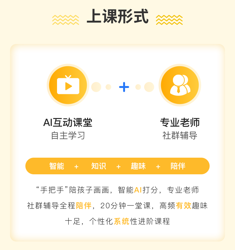 A:?小熊美术AI单节课20分钟,上课时长较短,相对于60分钟的直播课,对低幼年龄段的孩子比较友好,且符合3-8岁孩子的注意力集中时间。