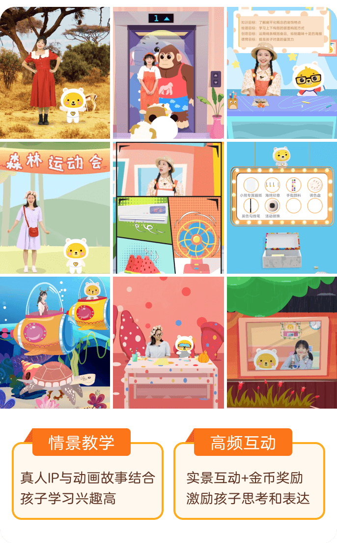 课件的设计结合了真人教学与动画,整堂课是由真人教师和动画IP小熊在对话中循序渐渐的完成,趣味性和互动性都很足,符合孩子的兴趣心理特征。