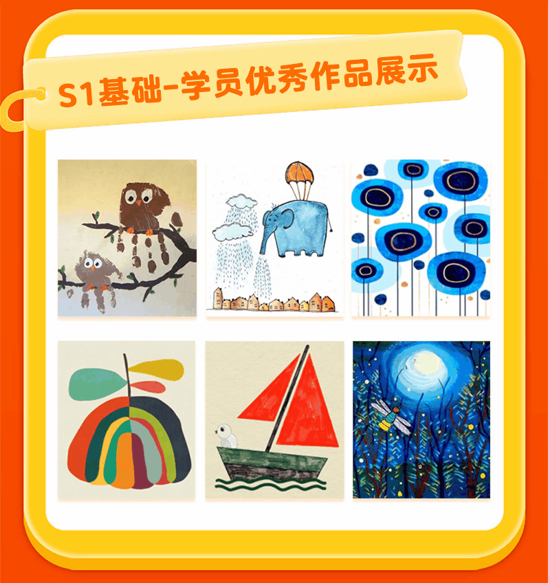 以S1级别为例,孩子将学习到基础造型、颜色混合、晕染技法、装饰线条、空间表现等绘画基础。