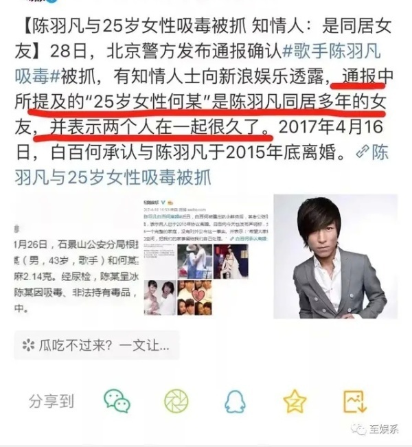 陈羽凡2017年因为吸毒被抓,才爆出,他和白百何2015年就已经离婚了。
